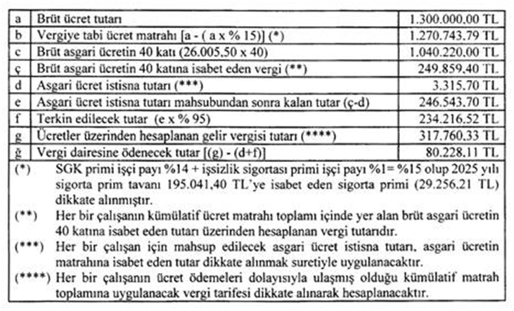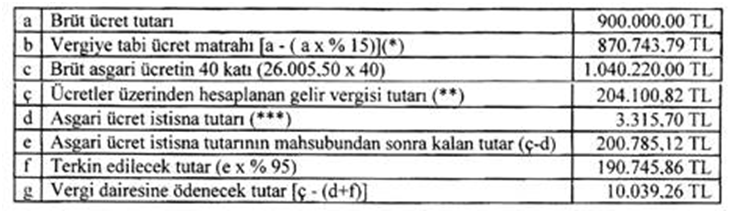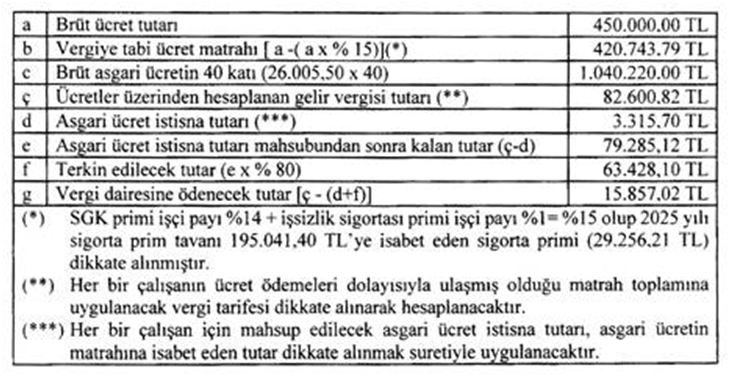 Ar-Ge merkezinde çalışan Bay (B)’nin ücret geliri, ilgili aydaki brüt asgari ücretin 40 katından fazla olduğundan (A) A.Ş.’nin yararlanabileceği ve terkine konu edilecek teşvik tutarı, asgari ücretin brüt tutarının 40 katına isabet eden (249.859,40 TL) vergiden, asgari ücret istisnasına isabet eden gelir vergisinin mahsubu yapıldıktan sonra kalan 246.543,70 TL gelir vergisi tutarının % 95’i olan 234.216,52 TL’si olacaktır. Söz konusu ücret üzerinden hesaplanan gelir vergisinden terkin edilecek tutar ile ilgili aydaki asgari ücret istisnası düşüldükten sonra kalan [317.760,33 TL – (3.315,70 TL + 234.216,52 TL)] 80.228,11 TL tutarındaki gelir vergisi ise vergi dairesine ödenecektir.