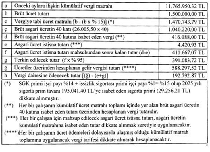 “Örnek 3: (Ç) Anonim Şirketinin Ar-Ge merkezinde tam zamanlı olarak çalışan doktoralı Bay (D)’ye Ar-Ge faaliyeti kapsamında haftalık 45 saati geçmeyen çalışmasına ilişkin olarak 2025 yılı Ocak ayından itibaren ayda 1.500.000 TL brüt ücret ödenmektedir.