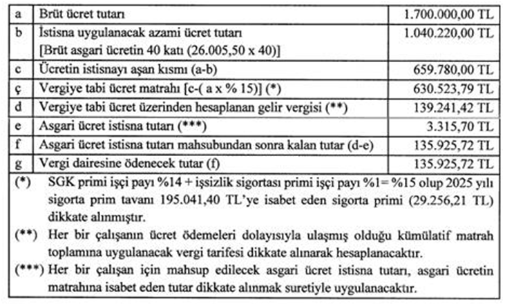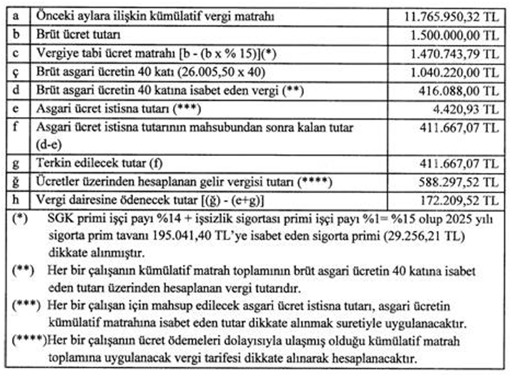 Örnek 3: (G) Teknoloji Geliştirme Bölgesinde faaliyette bulunan (H) A.Ş.’de yazılım personeli olarak çalışan Bay (I)’ya yazılım faaliyeti kapsamında haftalık 45 saati geçmeyen çalışmasına ilişkin olarak 1/1/2025 tarihinden itibaren ayda 1.500.000 TL brüt ücret ödenmektedir.