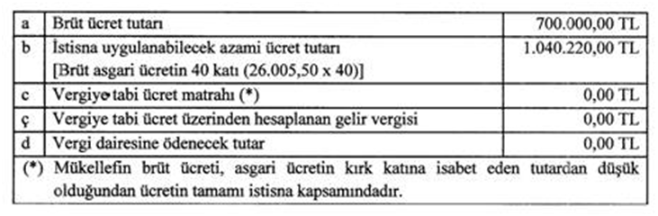 Araştırma altyapı projesinde çalışan Bayan (N)’nin bu proje karşılığında elde etmiş olduğu ücret geliri, ödemenin yapıldığı ayda geçerli olan asgari ücretin aylık brüt tutarının 40 katını aştığından, aşan kısmı ücret olarak vergilendirilecektir. Bayan (N)’nin ilgili aydaki ücret tutarının asgari ücretin 40 katının altında kalması halinde ise ücret gelirinin tamamı istisna kapsamında değerlendirilecektir.