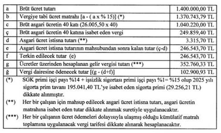 Örnek 1: (A) Teknoloji Geliştirme Bölgesinde faaliyette bulunan (B) A.Ş.’de yazılım personeli olarak 2025 yılının Eylül ayında işe başlayan Bay (C)’ye yazılım faaliyeti kapsamında haftalık 45 saati geçmeyen çalışmasına ilişkin olarak 1.400.000 TL brüt ücret ödenmiştir.
