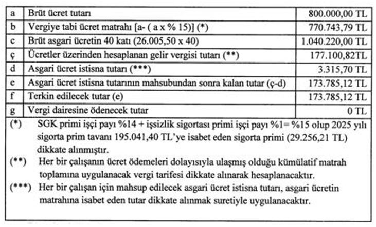 (A) Teknoloji Geliştirme Bölgesinde faaliyette bulunan (B) A.Ş.’de çalışan Bay (C)’nin ücret geliri ilgili aydaki brüt asgari ücretin 40 katından fazla olduğundan, (B) A.Ş.’nin yararlanacağı ve terkine konu edilecek teşvik tutarı, asgari ücretin brüt tutarının 40 katına isabet eden (249.859,40 TL) vergiden, asgari ücrete isabet eden gelir vergisinin mahsubu yapıldıktan sonra kalan 246.543,70 TL olacaktır. Personele ödenen ücretin vergi matrahı üzerinden hesaplanan gelir vergisinden terkin edilecek tutar ile ilgili aydaki asgari ücret istisnası düşüldükten sonra kalan [352.760,33 TL – (246.543,70 TL + 3.315,70 TL)] 102.900,93 TL tutarındaki gelir vergisi ise vergi dairesine ödenecektir.