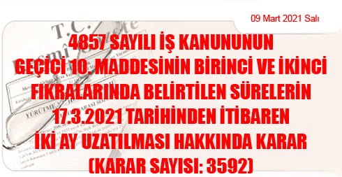 4857 Sayılı İş Kanununun Geçici 10 uncu Maddesinin Birinci ve İkinci Fıkralarında Belirtilen Sürelerin … Karar Sayısı: 3592)