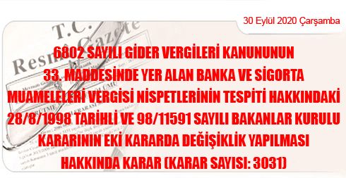 6802 Sayılı GVK 33. Mad. Yer Alan Banka ve Sigorta Muameleleri Vergisi Nispetlerinin Tespiti Hak. 28/8/1998 Tarihli ve 98/11591 Sayılı BKK Eki Kararda Değişiklik Yapılması Hakkında Karar Sayısı:3031