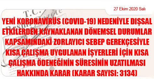 Yeni Koronavirüs (Covid-19) Nedeniyle Dışsal Etkilerden Kaynaklanan Dönemsel Durumlar Kapsamındaki Zorlayıcı Sebep Gerekçesiyle Kısa Çalışma Uygulanan İşyerleri İçin Kısa Çalışma Ödeneğinin Süresinin Uzatılması Hakkında Karar (Karar Sayısı: 3134)