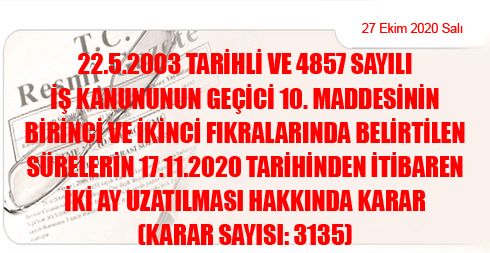 22.5.2003 Tarihli ve 4857 Sayılı İş Kanununun Geçici 10. Maddesinin Birinci ve İkinci Fıkralarında Belirtilen Sürelerin 17.11.2020 Tarihinden İtibaren İki Ay Uzatılması Hakkında Karar (Karar Sayısı: 3135)