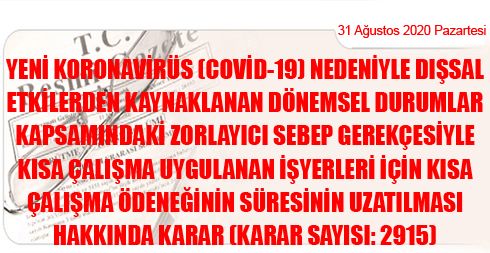 Yeni Koronavirüs (Covid-19) Nedeniyle Dışsal Etkilerden Kaynaklanan Dönemsel Durumlar Kapsamındaki Zorlayıcı Sebep Gerekçesiyle Kısa Çalışma Uygulanan İşyerleri İçin Kısa Çalışma Ödeneğinin Süresinin Uzatılması Hakkında Karar (Karar Sayısı: 2915)
