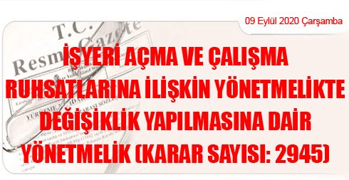 İşyeri Açma ve Çalışma Ruhsatlarına İlişkin Yönetmelikte Değişiklik Yapılmasına Dair Yönetmelik (Karar Sayısı: 2945)
