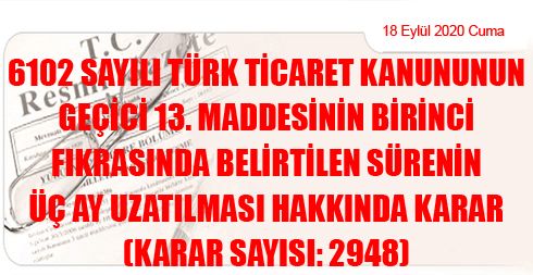 6102 Sayılı Türk Ticaret Kanununun Geçici 13 üncü Maddesinin Birinci Fıkrasında Belirtilen Sürenin Üç Ay Uzatılması Hakkında Karar (Karar Sayısı: 2948)