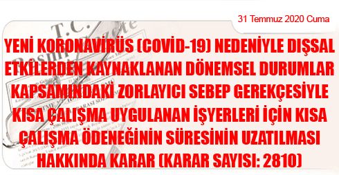 Yeni Koronavirüs (Covid-19) Nedeniyle Dışsal Etkilerden Kaynaklanan Dönemsel Durumlar Kapsamındaki Zorlayıcı Sebep Gerekçesiyle Kısa Çalışma Uygulanan İşyerleri İçin Kısa Çalışma Ödeneğinin Süresinin Uzatılması Hakkında Karar (Karar Sayısı: 2810)