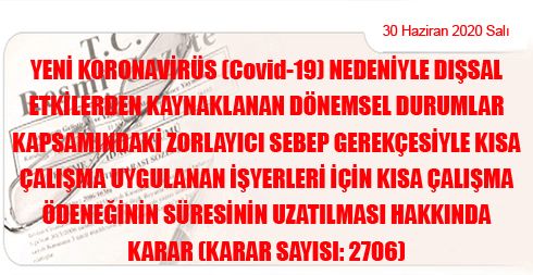 Yeni Koronavirüs (Covid-19) Nedeniyle Dışsal Etkilerden Kaynaklanan Dönemsel Durumlar Kapsamındaki Zorlayıcı Sebep Gerekçesiyle Kısa Çalışma Uygulanan İşyerleri İçin Kısa Çalışma Ödeneğinin Süresinin Uzatılması Hakkında Karar (Karar Sayısı: 2706)