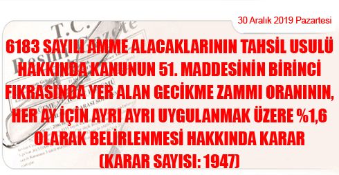 6183 Sayılı Amme Alacaklarının Tahsil Usulü Hakkında Kanunun 51. Mad. Birinci Fıkrasında Yer Alan Gecikme Zammı Oranının, Her Ay İçin Ayrı Ayrı Uygulanmak Üzere %1,6 Olarak Bel. Karar Sayısı:1947