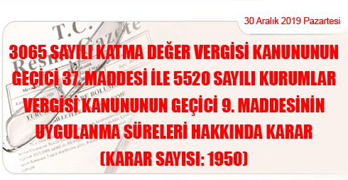 3065 Sayılı Katma Değer Vergisi Kanununun Geçici 37 nci Maddesi ile 5520 Sayılı Kurumlar Vergisi Kanununun Geçici 9 uncu Maddesinin Uygulanma Süreleri Hakkında Karar (Karar Sayısı: 1950)
