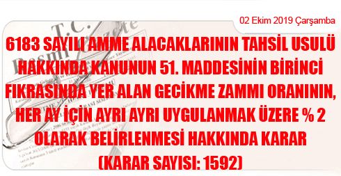 6183 Sayılı Amme Alacaklarının Tahsil Usulü Hakkında Kanunun 51. Maddesinin Birinci Fıkrasında Yer Alan Gecikme Zammı Oranının, Her Ay İçin Ayrı Ayrı Uygulanmak Üzere % 2 Olarak Belirlenmesi Hakkında Karar (Karar Sayısı: 1592)