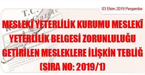 Meslekî Yeterlilik Kurumu Meslekî Yeterlilik Belgesi Zorunluluğu Getirilen Mesleklere İlişkin Tebliğ (Sıra No: 2019/1)