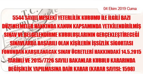 5544 Sayılı MYK ile İlg.Bazı Düz.Hak.Kan.Kap.Yetki. Sınav ve Belgelen. Kuruluş. Gerçek. Sınav. Başarılı Olan Kişilerin İşsizlik Sigortası Fonundan Karşı. Sınav Ücretleri Hak. 14/5/2015 Tarihli ve 2015/7726 Sayılı BKK’da Değ.Yap.Dair Kar.Say.:1598