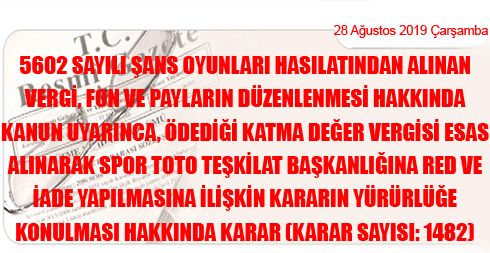 5602 Sayılı Şans Oyunları Hasılatından Alınan Vergi, Fon ve Payların Düzen. Hak. Kanun Uyarınca, Ödediği KD Vergisi Esas Alınarak Spor Toto Teşkilat Başkan. Red ve İade Yapılmasına İliş. Kararın Yürürlüğe Konulması Hak. Karar Sayısı: 1482