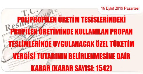 Polipropilen Üretim Tesislerindeki Propilen Üretiminde Kullanılan Propan Teslimlerinde Uygulanacak Özel Tüketim Vergisi Tutarının Belirlenmesine Dair Karar (Karar Sayısı: 1542)