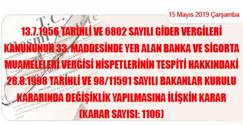 13/7/1956 Tarihli ve 6802 Sayılı GVK 33. Mad. Yer Alan Banka ve Sigorta Muameleleri Vergisi Nispetlerinin Tespiti Hak. 28/8/1998 Tarihli ve 98/11591 Sayılı BKK Değişiklik Yapılmasına İlişkin Karar (Karar Sayısı: 1106)