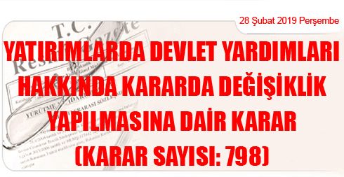 Yatırımlarda Devlet Yardımları Hakkında Kararda Değişiklik Yapılmasına Dair Karar (Karar Sayısı: 798)