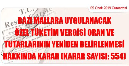 Bazı Mallara Uygulanacak Özel Tüketim Vergisi Oran ve Tutarlarının Yeniden Belirlenmesi Hakkında Karar (Karar Sayısı: 554)