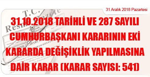31/10/2018 Tarihli ve 287 Sayılı Cumhurbaşkanı Kararının Eki Kararda Değişiklik Yapılmasına Dair Karar (Karar Sayısı: 541)