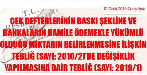 Çek Defterlerinin Baskı Şekline ve Bankaların Hamile Ödemekle Yükümlü Olduğu Miktarın Belirlenmesine İlişkin Tebliğ (Sayı: 2010/2)’de Değişiklik Yapılmasına Dair Tebliğ (Sayı: 2019/1)