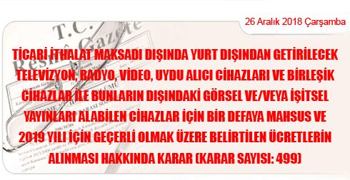 Ticari İthalat Maksadı Dışında Yurt Dışından Getirilecek Televizyon, Radyo, Video, Uydu Alıcı Cihazları ve Birleşik Cihazlar ile Bunların Dışındaki Görsel ve/veya İşitsel Yayınları Alabilen Cihazlar İçin Bir Defaya …(Karar Sayısı: 499)