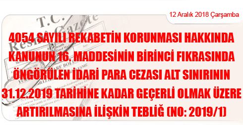 4054 Sayılı Rekabetin Korunması Hakkında Kanunun 16. Maddesinin Birinci Fıkrasında Öngörülen İdari Para Cezası Alt Sınırının 31/12/2019 Tarihine Kadar Geçerli Olmak Üzere Artırılmasına İlişkin Tebliğ (No: 2019/1)
