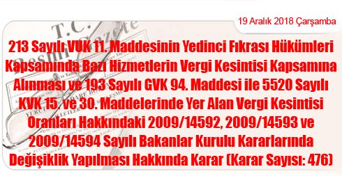 213 Say. VUK 11. Mad. 7. Fıkrası Hükümleri Kapsamında Bazı Hizmetlerin Vergi Kesintisi Kapsamına Alınması ve 193 Say. GVK 94. Mad. ile 5520 Say. KVK 15. ve 30. Mad. Yer Alan Vergi Kesintisi Oranları Hak. 2009/14592, 2009/14593 ve 2009/14594 Say. Bakanlar Kurulu