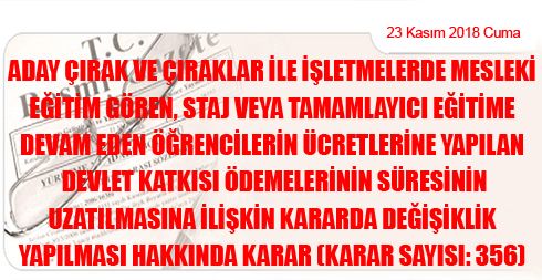 Aday Çırak ve Çıraklar ile İşletmelerde Mesleki Eğitim Gören, Staj veya Tamamlayıcı Eğitime Devam Eden Öğrencilerin Ücretlerine Yapılan Devlet Katkısı Ödemelerinin Süresinin Uzatılmasına İlişkin Kararda Değiş. (Karar Sayısı: 356)