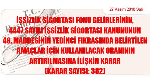 İşsizlik Sigortası Fonu Gelirlerinin, 4447 Sayılı İşsizlik Sigortası Kanununun 48 inci Maddesinin Yedinci Fıkrasında Belirtilen Amaçlar İçin Kullanılacak Oranının Artırılmasına İlişkin Karar (Karar Sayısı: 382)