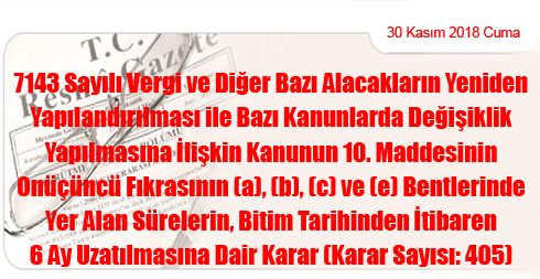 7143 Sayılı Kanunun 10. Maddesinin Onüçüncü Fıkrasının (a), (b), (c) ve (e) Bentlerinde Yer Alan Sürelerin, Bitim Tarihinden İtibaren 6 Ay Uzatılmasına Dair Karar (Karar Sayısı: 405)