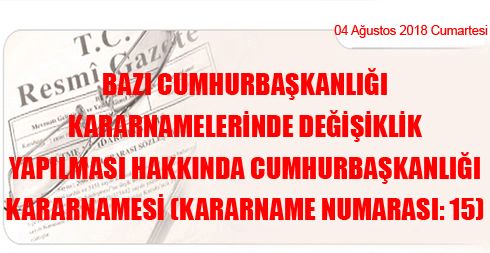 Bazı Cumhurbaşkanlığı Kararnamelerinde Değişiklik Yapılması Hakkında Cumhurbaşkanlığı Kararnamesi (Kararname Numarası: 15)