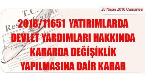 2018/11651 Yatırımlarda Devlet Yardımları Hakkında Kararda Değişiklik Yapılmasına Dair Karar