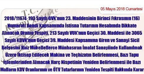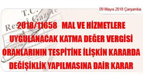 2018/11658 Mal ve Hizmetlere Uygulanacak Katma Değer Vergisi Oranlarının Tespitine İlişkin Kararda Değişiklik Yapılmasına Dair Karar