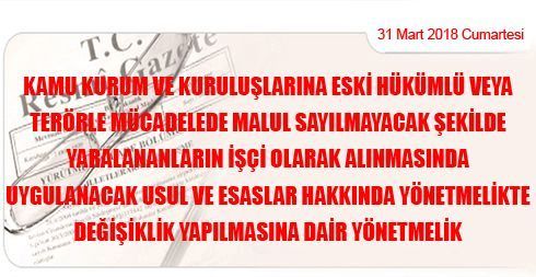 Kamu Kurum ve Kuruluşlarına Eski Hükümlü veya Terörle Mücadelede Malul Sayılmayacak Şekilde Yaralananların İşçi Olarak Alınmasında Uygulanacak Usul ve Esaslar Hakkında Yönetmelikte Değişiklik Yapılmasına Dair Yönetmelik