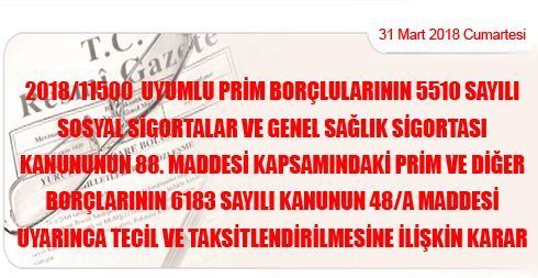 2018/11500 Uyumlu Prim Borçlularının 5510 Sayılı Sosyal Sigortalar ve Genel Sağlık Sigortası Kanununun 88. Maddesi Kapsamındaki Prim ve Diğer Borçlarının 6183 Sayılı Kanunun 48/A Maddesi Uyarınca Tecil ve Taksitlendirilmesine İlişkin Karar