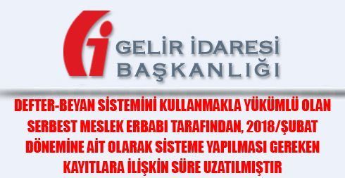 Defter-Beyan Sistemini Kullanmakla Yükümlü Olan Serbest Meslek Erbabı Tarafından, 2018/Şubat Dönemine Ait Olarak Sisteme Yapılması Gereken Kayıtlara İlişkin Süre Uzatılmıştır