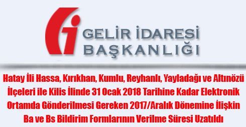 Hatay İli Hassa, Kırıkhan, Kumlu, Reyhanlı, Yayladağı ve Altınözü İlçeleri ile Kilis İlinde 31 Ocak 2018 Tarihine Kadar Elektronik Ortamda Gönderilmesi Gereken 2017/Aralık Dönemine İlişkin Ba ve Bs Bildirim Formlarının Verilme Süresi Uzatıldı