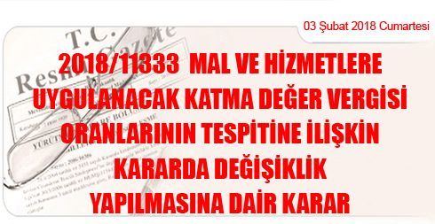 2018/11333 Mal ve Hizmetlere Uygulanacak Katma Değer Vergisi Oranlarının Tespitine İlişkin Kararda Değişiklik Yapılmasına Dair Karar