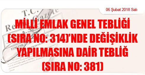 Milli Emlak Genel Tebliği (Sıra No: 314)’nde Değişiklik Yapılmasına Dair Tebliğ (Sıra No: 381)
