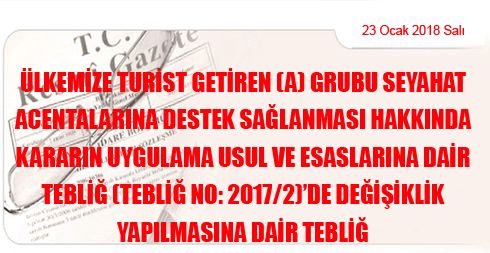 Ülkemize Turist Getiren (A) Grubu Seyahat Acentalarına Destek Sağlanması Hakkında Kararın Uygulama Usul ve Esaslarına Dair Tebliğ (Tebliğ No: 2017/2)’de Değişiklik Yapılmasına Dair Tebliğ