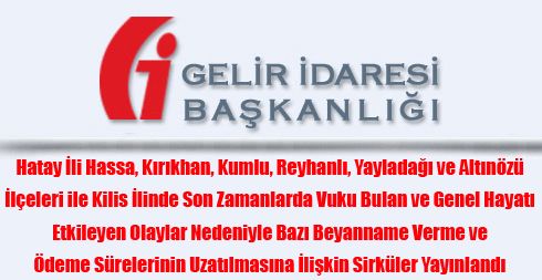Hatay İli Hassa, Kırıkhan, Kumlu, Reyhanlı, Yayladağı ve Altınözü İlçeleri ile Kilis İlinde Son Zamanlarda Vuku Bulan ve Genel Hayatı Etkileyen Olaylar Nedeniyle Bazı Beyanname Verme ve Ödeme Sürelerinin Uzatılmasına İlişkin Sirküler Yayınlandı