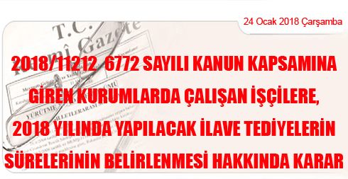2018/11212 6772 Sayılı Kanun Kapsamına Giren Kurumlarda Çalışan İşçilere, 2018 Yılında Yapılacak İlave Tediyelerin Sürelerinin Belirlenmesi Hakkında Karar