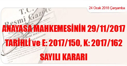 Anayasa Mahkemesinin 29/11/2017 Tarihli ve E: 2017/150, K: 2017/162 Sayılı Kararı