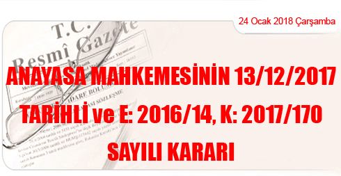 Anayasa Mahkemesinin 13/12/2017 Tarihli ve E: 2016/14, K: 2017/170 Sayılı Kararı
