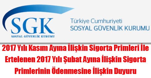 2017 Yılı Kasım Ayına İlişkin Sigorta primleri İle Ertelenen 2017 Yılı Şubat Ayına İlişkin Sigorta Primlerinin Ödenmesine İlişkin Duyuru