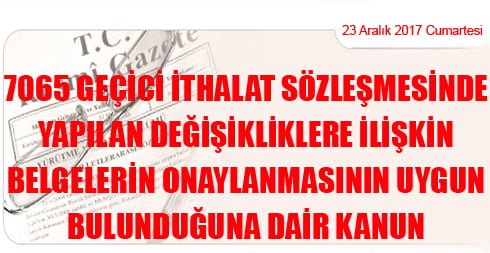7065 Geçici İthalat Sözleşmesinde Yapılan Değişikliklere İlişkin Belgelerin Onaylanmasının Uygun Bulunduğuna Dair Kanun
