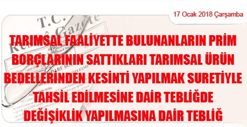 Tarımsal Faaliyette Bulunanların Prim Borçlarının Sattıkları Tarımsal Ürün Bedellerinden Kesinti Yapılmak Suretiyle Tahsil Edilmesine Dair Tebliğde Değişiklik Yapılmasına Dair Tebliğ